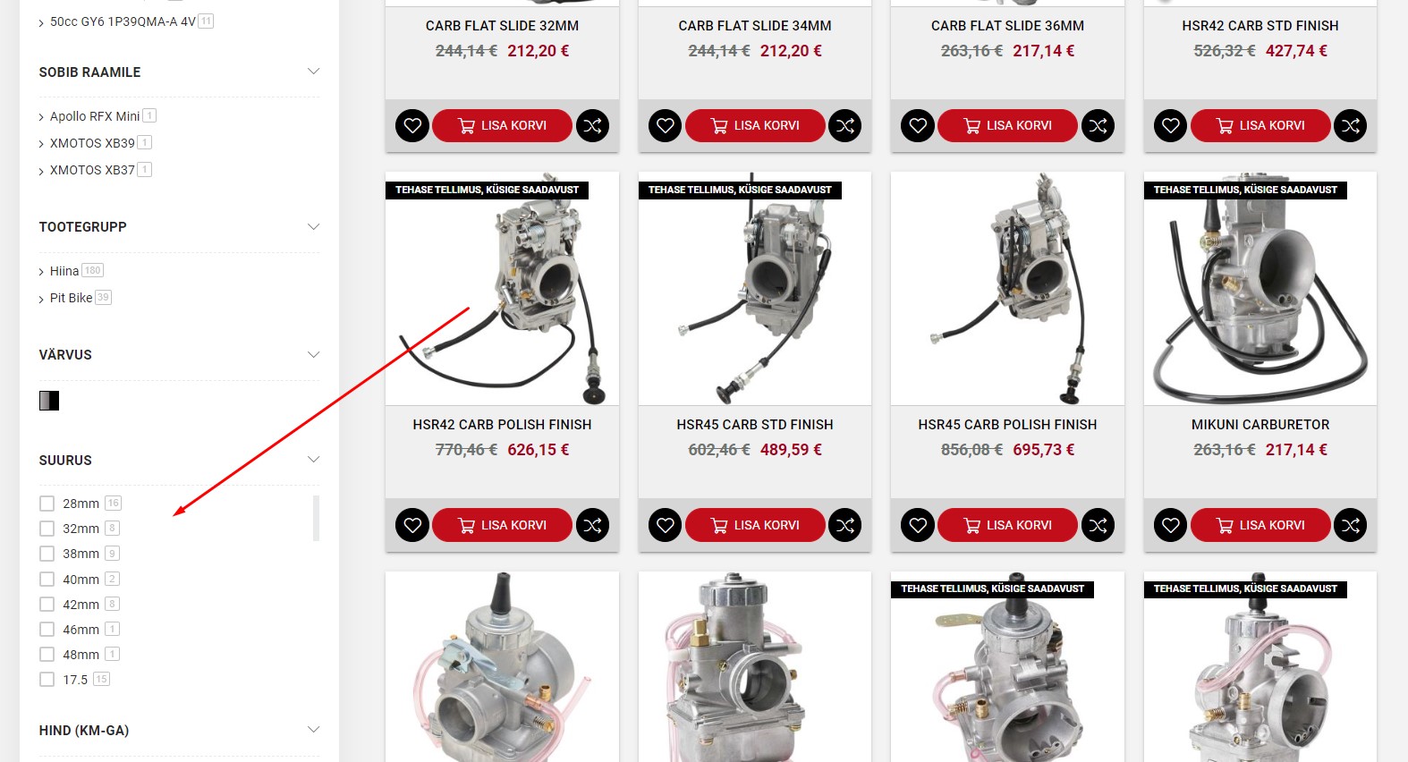 Kasuta filtreid, et leida omale sobivat mõõtu karburaator.